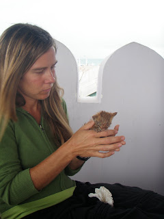 The next morning, I was hoping sleep would have erased my thoughts of the kitten … but of course, he was first on my mind. It was lashing rain and the dirtways between buildings were small streams – muddied and empty of people, of animals – no kitten in sight. We went up to our rooftop for breakfast and just as we finished our coffee, Laura heard the cries. I lept up and ran down three flights to the dirt below and poked around until the cries pulled me in their direction. Our little buddy was like a minnow in the ocean – so small in the big world, soaked to the bones and starving. I scooped him up, ran him to the rooftop and dried him with napkins. He cried for a minute and then burrowed his head between my knees, into my skirt and passed out – exhausted from fighting for his life.